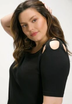 Ulla Popken Ausschnitte A-Linie V-Ausschnitt Halbarm – Camiseta Estampada – Schwarz
